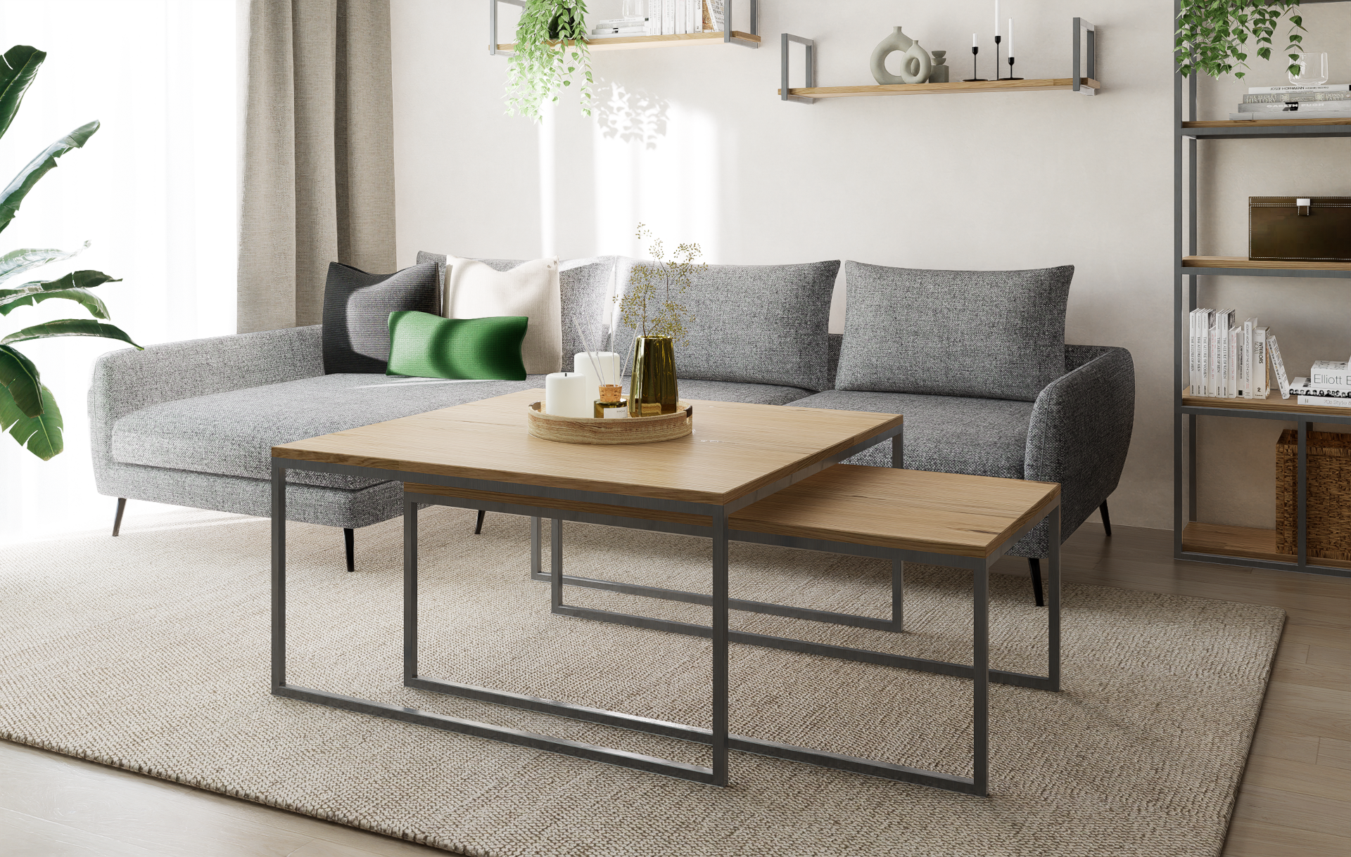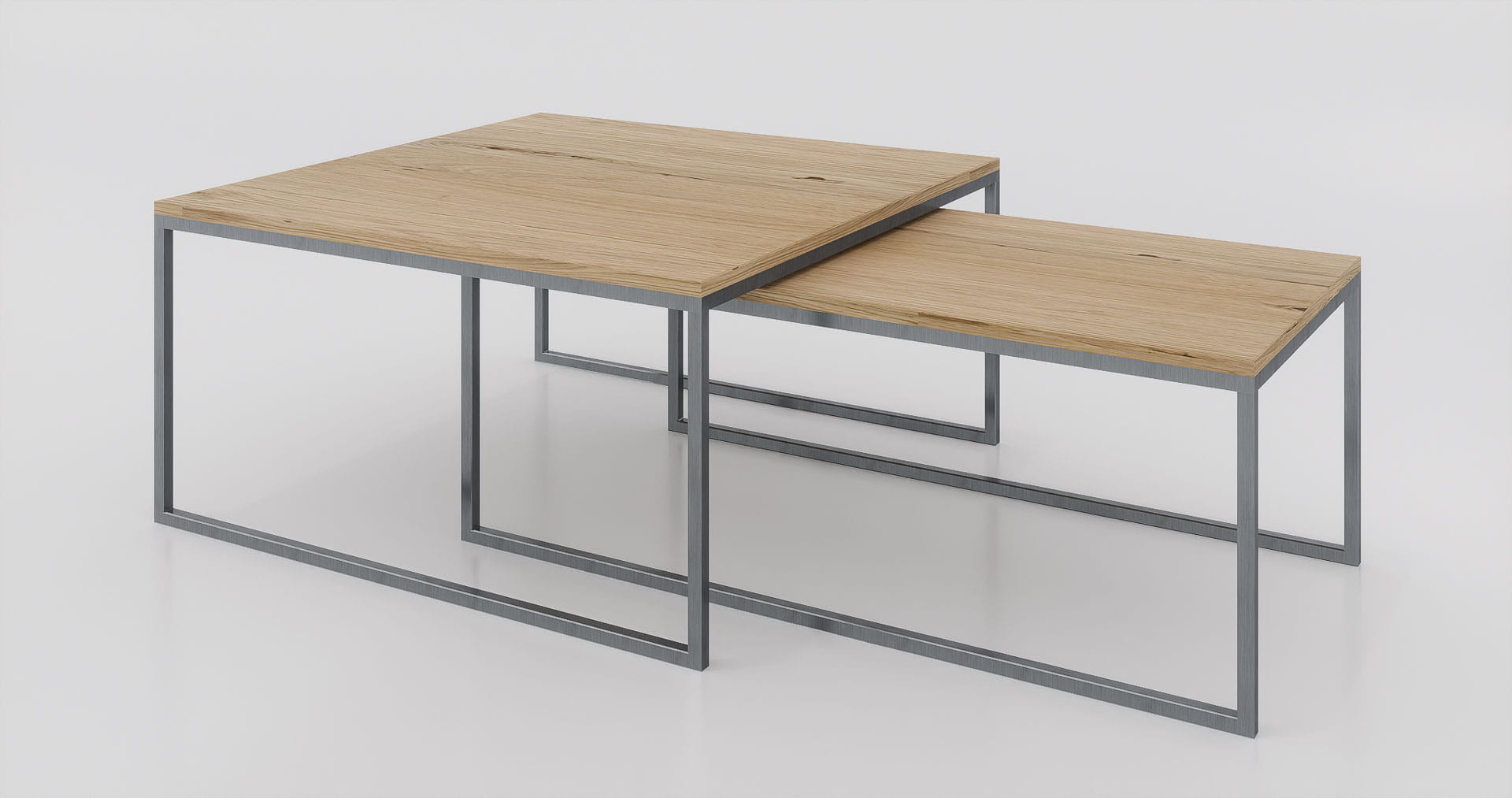 Chcesz nadać swojemu domowi wyjątkowy industrialny akcent? Dzięki wyjątkowo designerskiemu zestawowi stolików kawowych to możliwe. Prosta stalowa rama łączy się z pięknym, naturalnym dębowym blatem, co stanowi element dekoracyjny w salonie, korytarzu, biurze i nie tylko. Umieść doniczki, kubki, dekoracje lub czasopisma na stolikach, aby zawsze mieć je pod ręką.