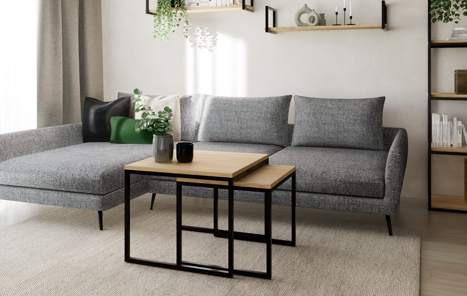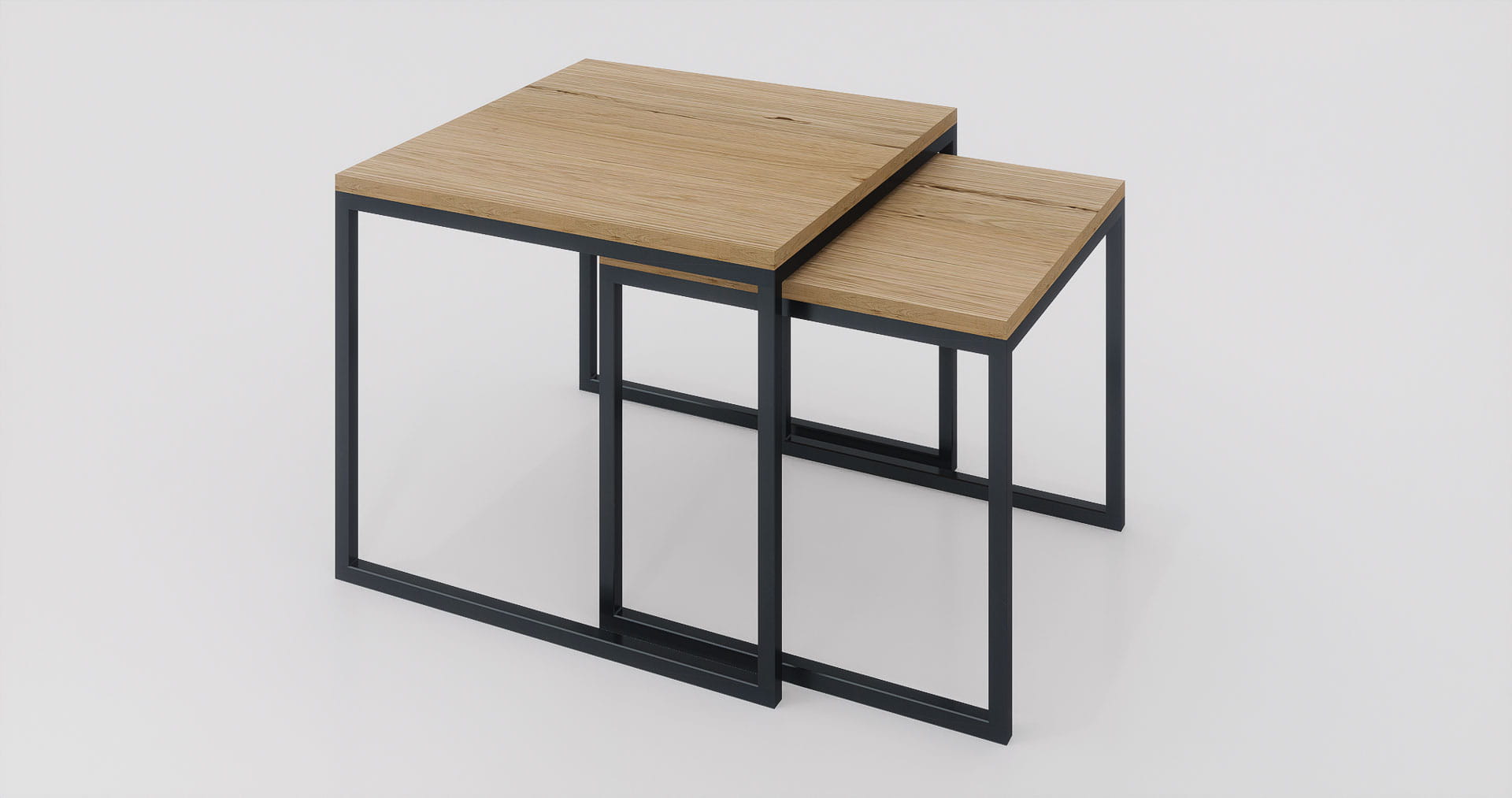 Chcesz nadać swojemu domowi wyjątkowy industrialny akcent? Dzięki wyjątkowo designerskiemu zestawowi stolików kawowych to możliwe. Prosta stalowa rama łączy się z pięknym, naturalnym dębowym blatem, co stanowi element dekoracyjny w salonie, korytarzu, biurze i nie tylko. Umieść doniczki, kubki, dekoracje lub czasopisma na stolikach, aby zawsze mieć je pod ręką.